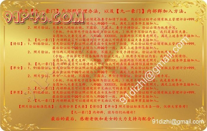 1、关于夫妻/情侣/单女验证:北上广不相信眼泪,交友圈只相信验证。如果大家对于上述条条框框的文字心存疑虑,我并不觉得你们足够真实真诚且真正准备好了,安安静静的做一名吃瓜群众其实也挺好。(备注:试图想凭91登录页面截图且无91验证贴入群的只能证明你是91视频区300大洋会员号,试图想凭结婚证或婚纱照入群的只能证明你是已婚单男,诸如此类的客官请自重!)